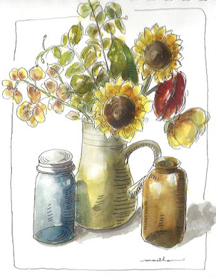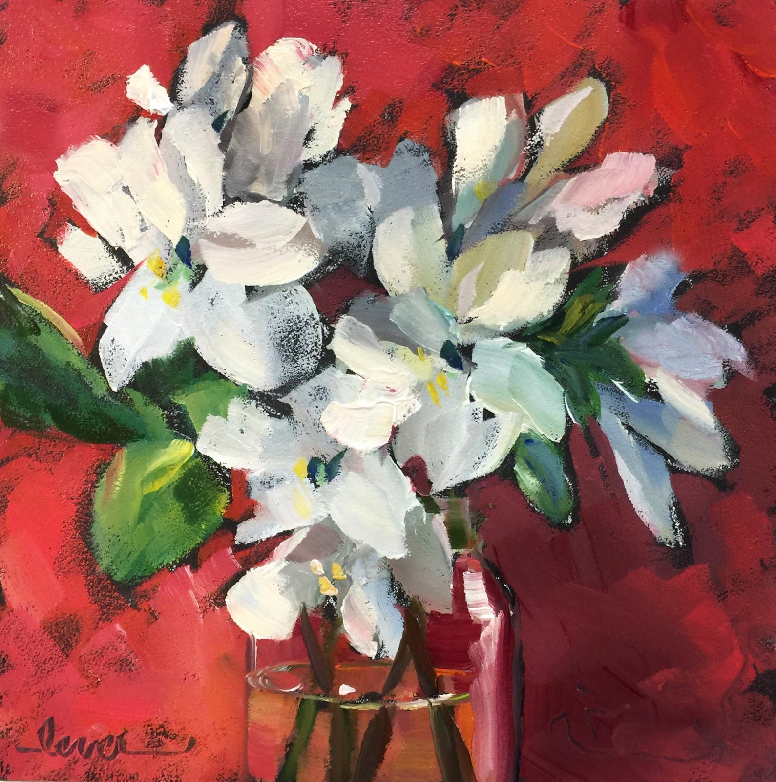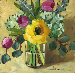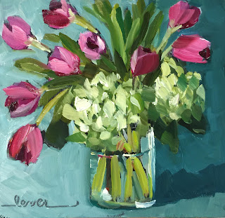 I bought some Tulips from Will Dixie the other day and it's amazing how long these Tulips have lasted. It's interesting that at first their stems are drooping then as they open up the stems get stronger and stand up. So I have painted these Tulips several times. Here is a quick progression of the painting of these beautiful dark reddish pink Tupils.