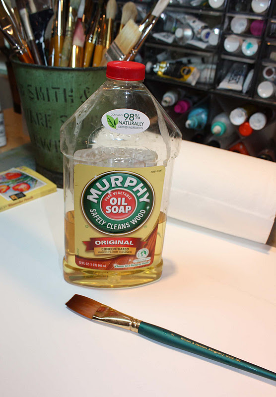 Well not only did I spill gesso on the rug I also left one of my favorite brushes in acrylic paint for several days and you know what that does..it petrifies the brush as we all know and have probably done. Well don't throw it away so fast. Bob Burridges has great tips and this is one that works! He washes all of his brushes with Murphy's Oil Soap and makes them all like new. If you petrify a brush just soak it in Murphys for 24 to 48 hours and it dissolves all the paint and makes it like new. This brush is like new again. Good ole Murpheys! It's magic stuff!